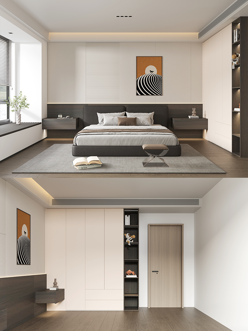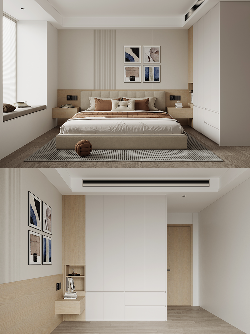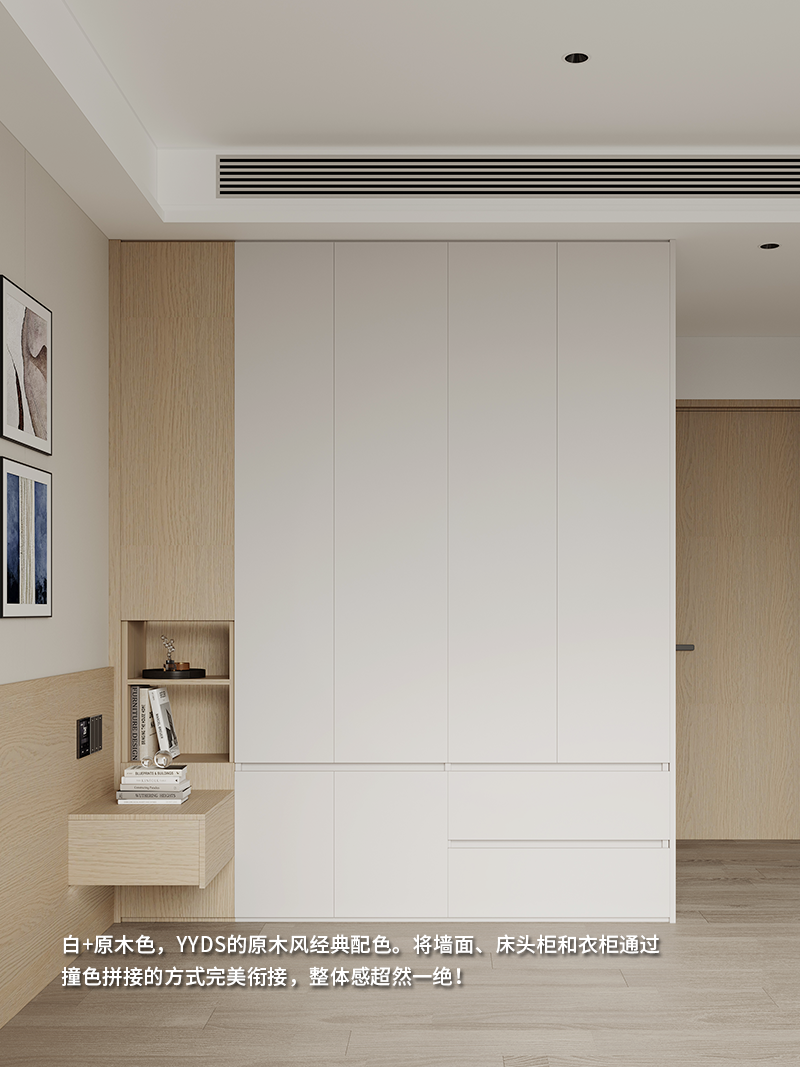 白+原木色,YYDS的原木风经典配色。将墙面、床头柜和衣柜通过撞色拼接的方式完美衔接,整体感超然一绝!床头柜采用开放格组合形式,方便常用物品的拿放,同时打破整体衣柜的单调感,造型更显精致高级。