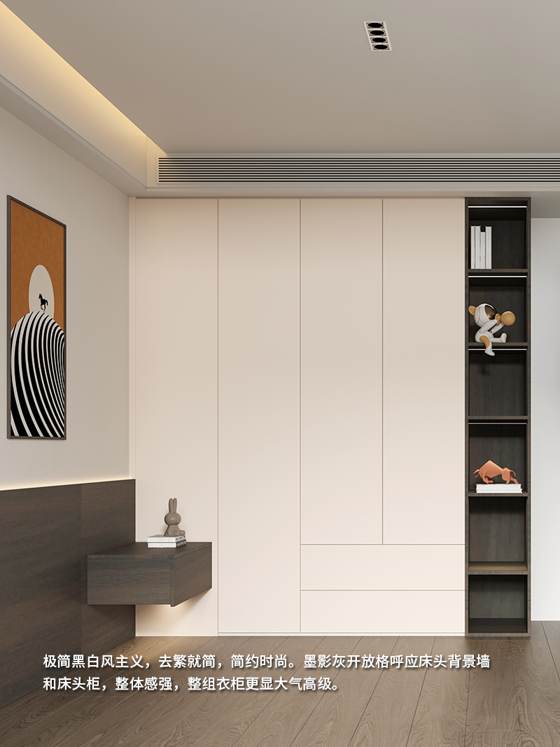 极简黑白风主义,去繁就简,简约时尚。不同于纯白的清冷和纯黑的生硬。凝霜白的优雅搭配神秘时尚的墨影灰,色调更显温馨高级。旁边设置一组开放格,常用衣物一目了然。墨影灰呼应床头背景墙和床头柜,整体感强,整组衣柜大气高级。